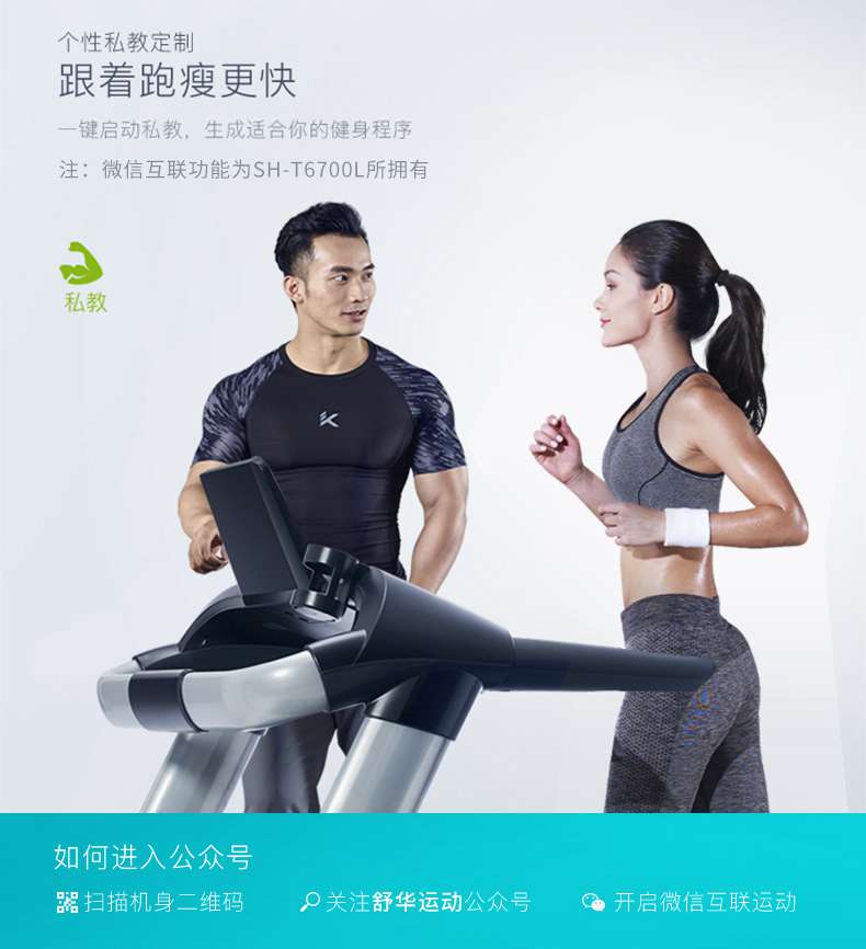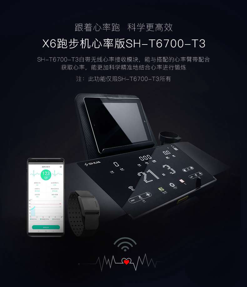 SH-T6700-T3跑步机为了帮助用户进行更加科学有效的运动,搭载谈求吧APP连接心率臂带实现心率控制,通过监测运动心率从而实现科学运动。
