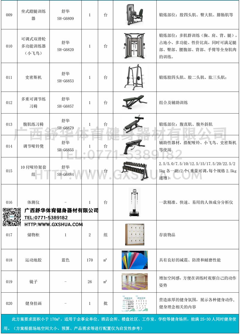 小飞鸟(1台)、史密斯机(1台)、多重可调节练习椅(1台)、腹肌板(1台)、10付哑铃套组(1套)、哑铃凳(1台)、上斜练习椅(1台),可以实现对不同肌肉群的针对性训练,满足肌肉训练需求,全方位激活身体机能。