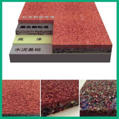 1、上层为PU颗粒或EPDM耐候性环保彩色颗粒,渗水的聚氨酯密封,下层采用机械施工缓冲底垫,符合比赛标准。